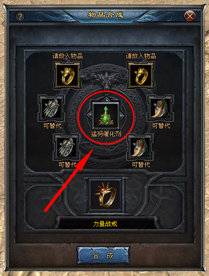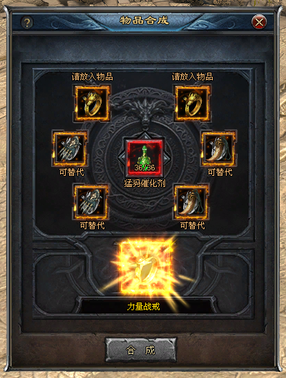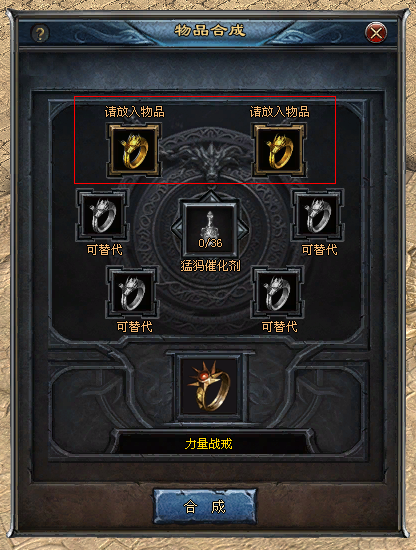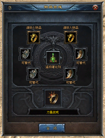 饰品合成 一、使用条件 1、开放节点:猛犸饰品、深渊饰品合成(蛮荒城开放后) 2、等级要求:玩家等级≥30级 3、合成NPC:魔神龙卫(龙城248,278) 4、合成方式:6件同职业天荒饰品加上若干催化剂的辅助,即可100%合成猛犸级饰品 二、合成步骤 1、例如:若想用“龙之战戒”,合成战士首饰中更高一级的“力量战戒”,需要在【请放入物品】*2的格子中,放入两个龙之战戒,这两格中的道具不可替代。 2、在下方【可替换】*4的格子中,再放入4个龙之战戒,如果道具数量不足,可以用同职业的“天荒级装备”来替代 最多可替代4个栏位,如下图所示:2个主位龙之战戒,使用了2个幽冥项链,2个幽冥手套作为替代首饰 3、龙之战戒是战士的首饰,因此,若玩家背包中有【猛犸催化剂】,放到中间的【催化剂】格子中。 4、点击【合成】按钮,无需消耗金币,即可100%合成一个“力量战戒” 饰品合成功能会有助想玩好游戏,想提升的玩家,有准确的提升方向, 另外, 在服务器相应首饰爆出奖励数量未达到数量之前,通过饰品合成产出的对应首饰也有爆出奖励标识。 |